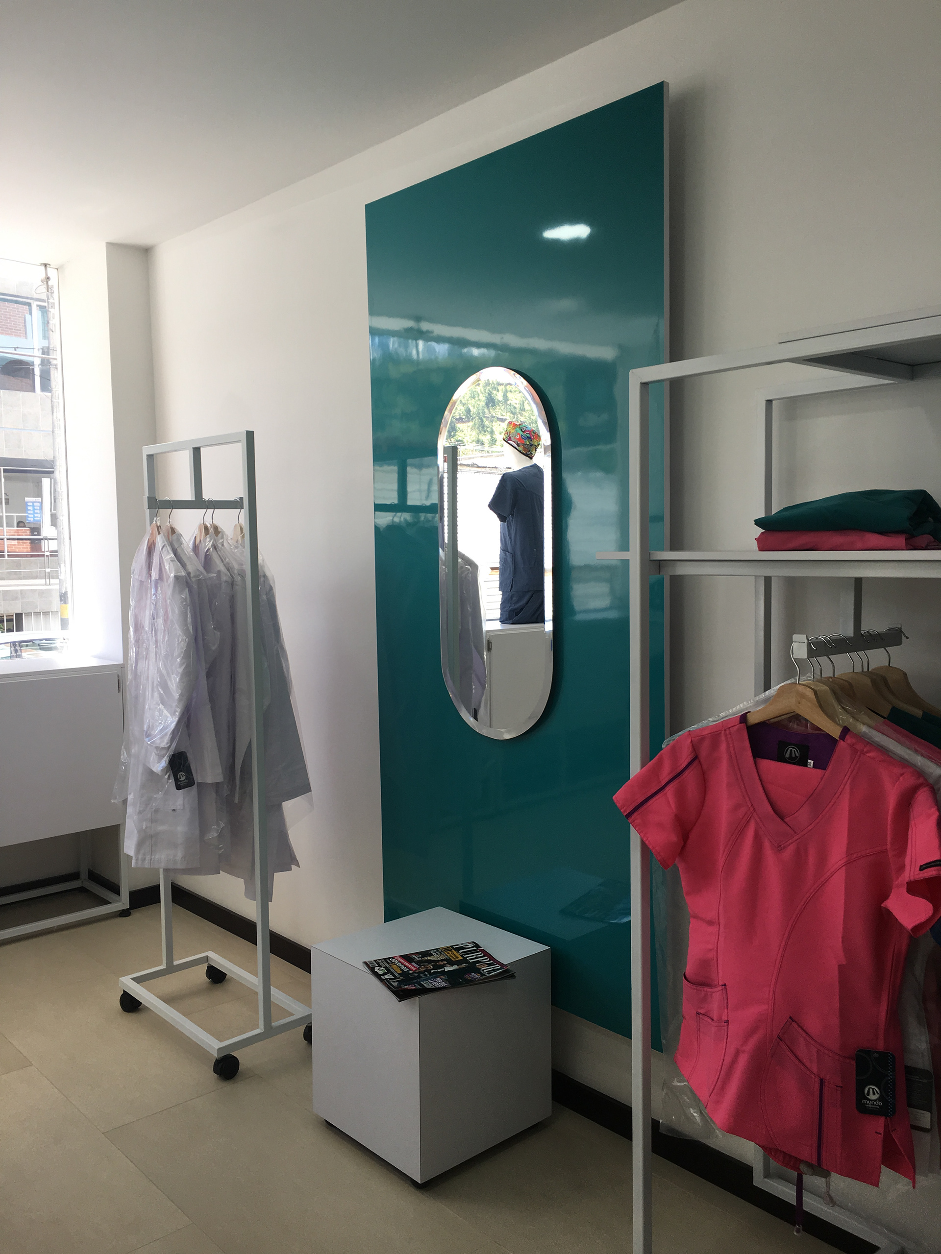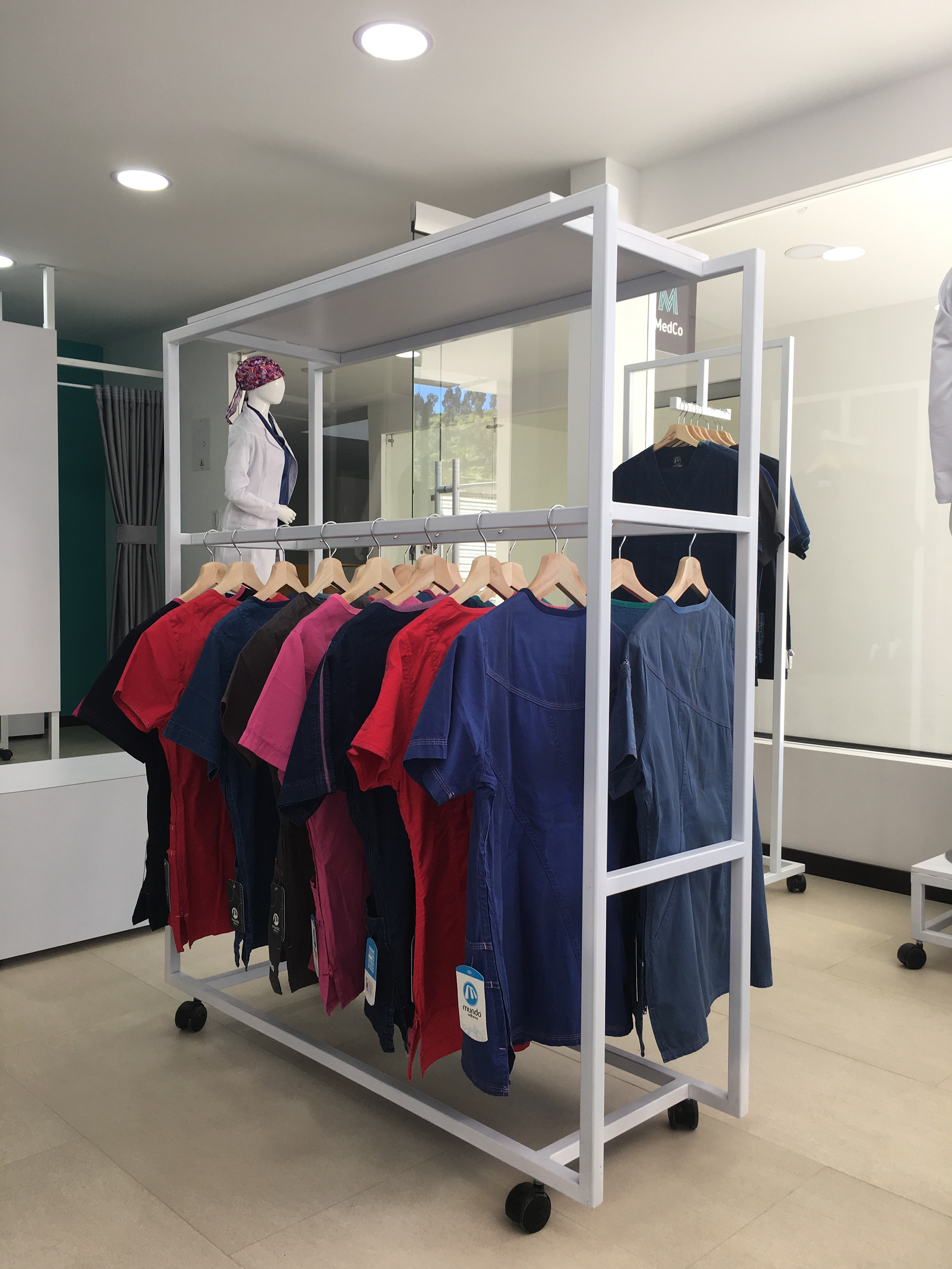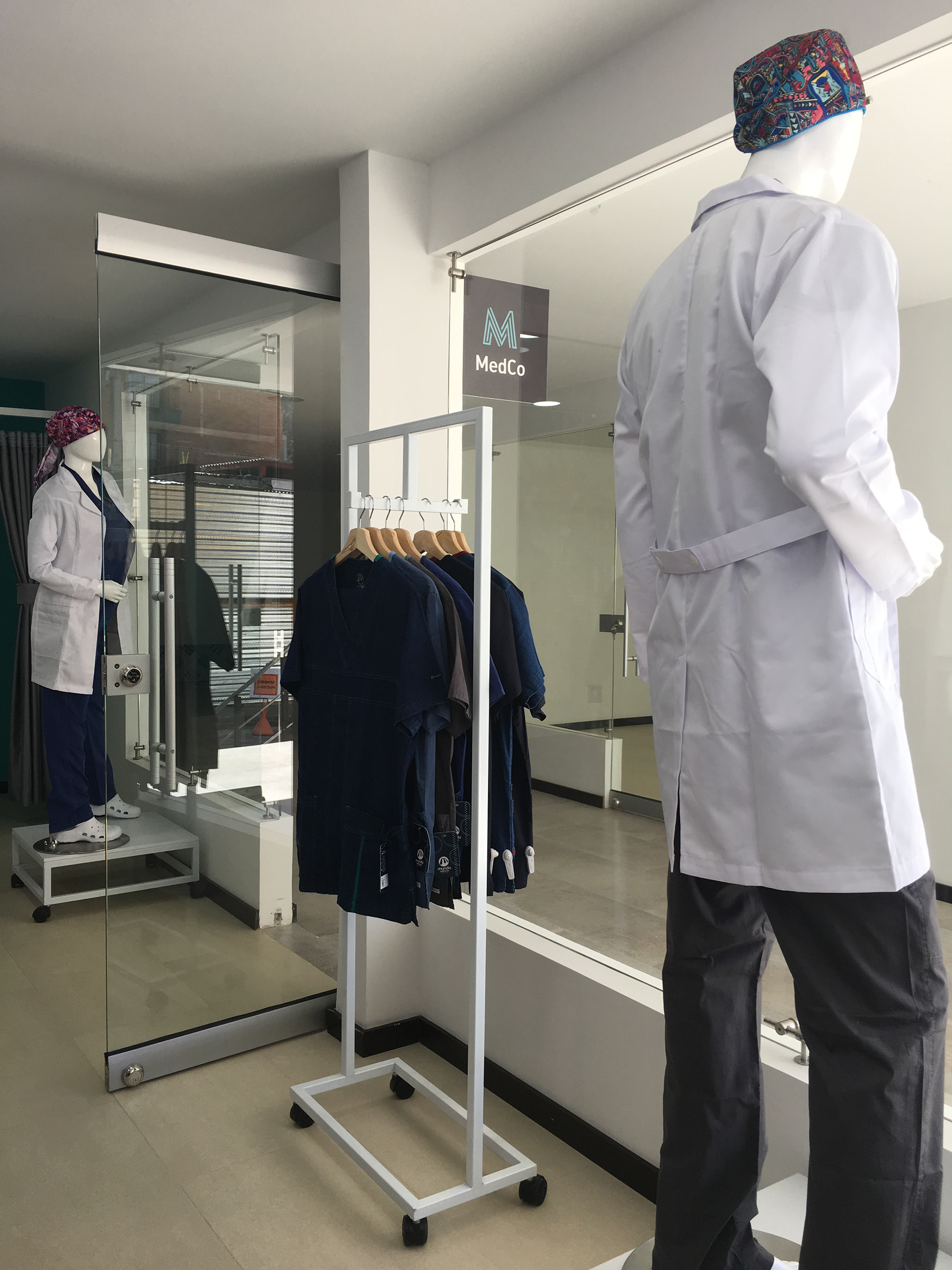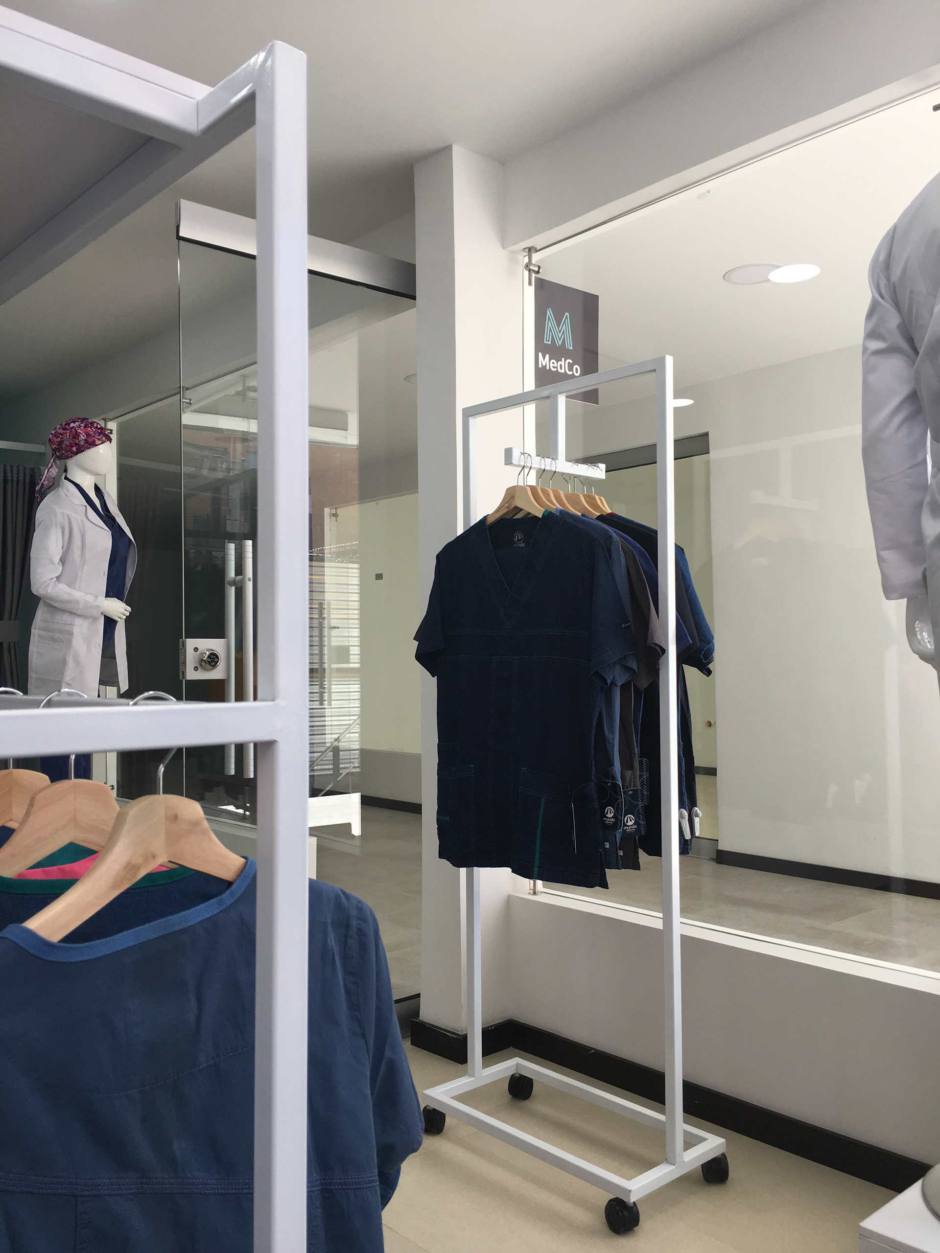 Diseño y montaje de mobiliario para atención y exhibición | Estanterías para bodega | Zona de vestier | Avisos rompetráfico interior y exterior. Cliente: MedCo