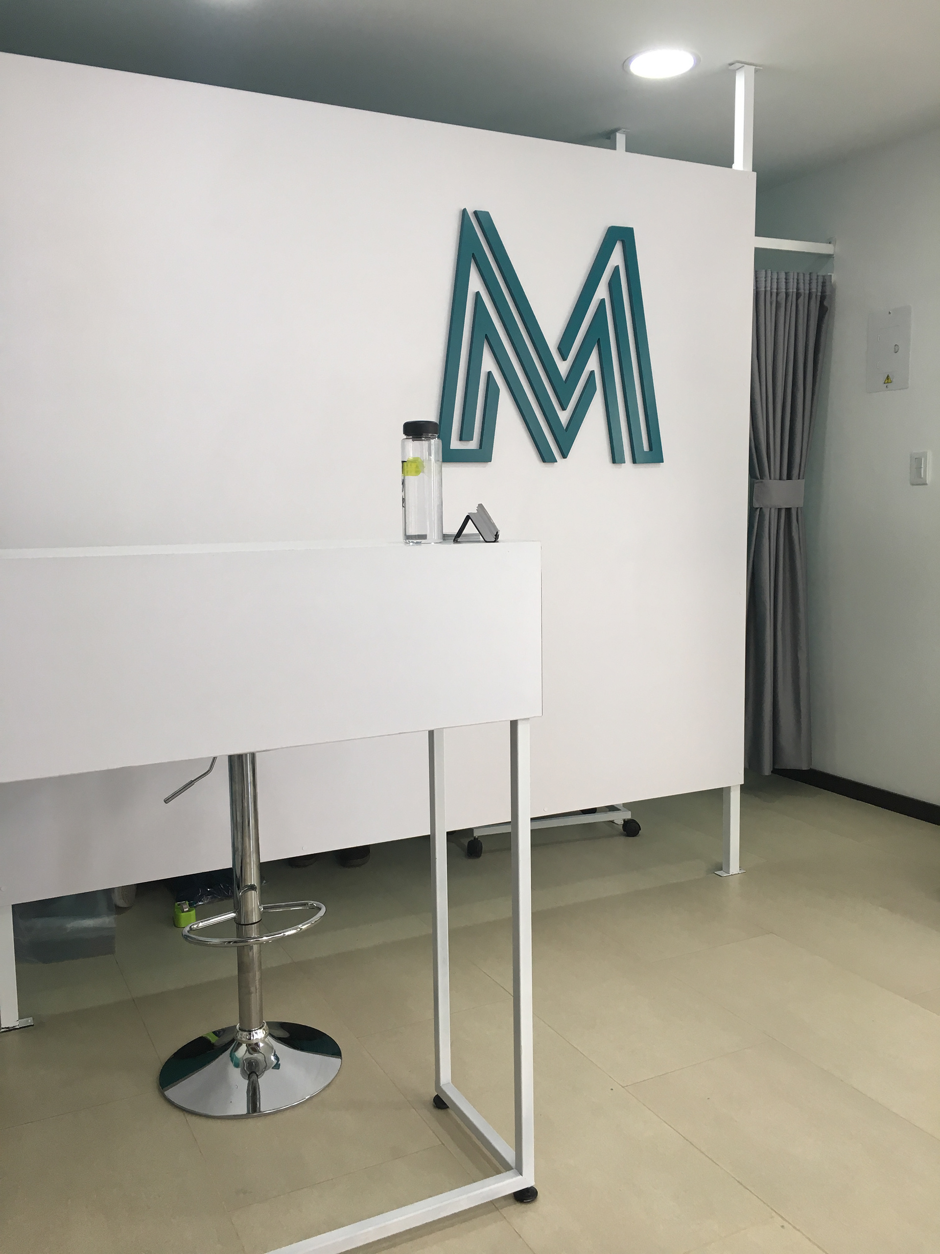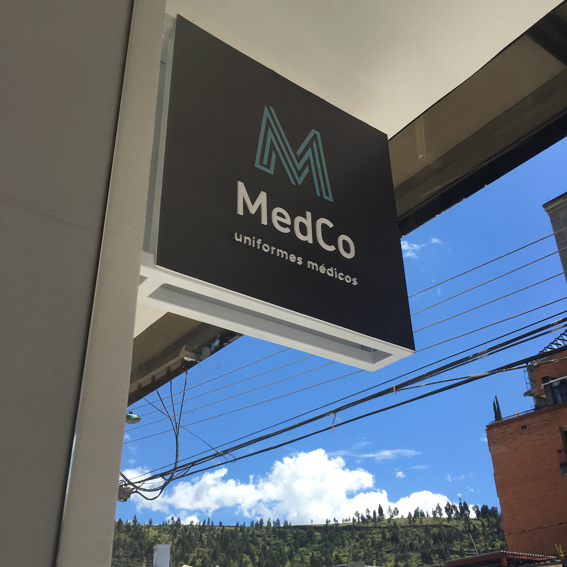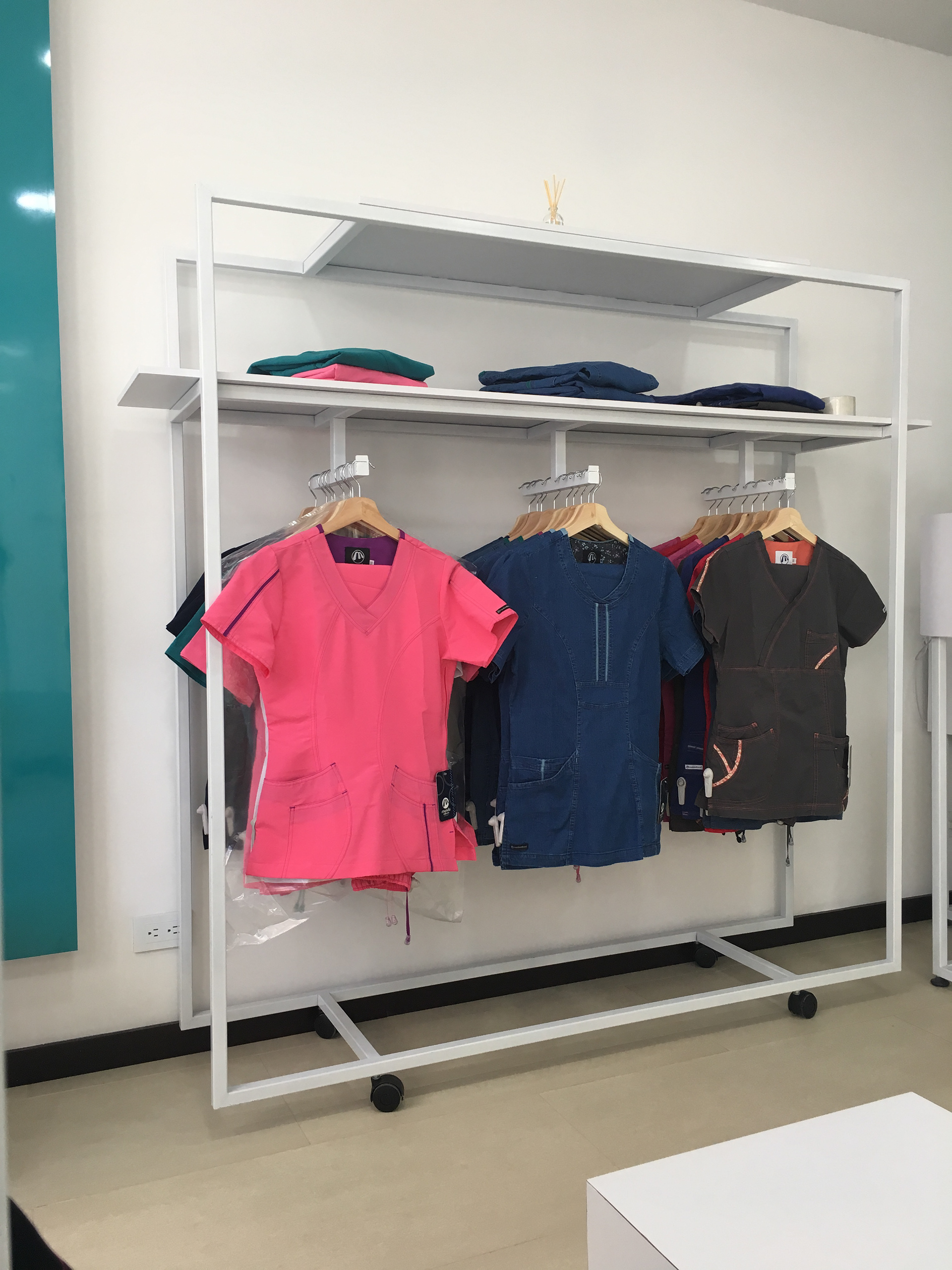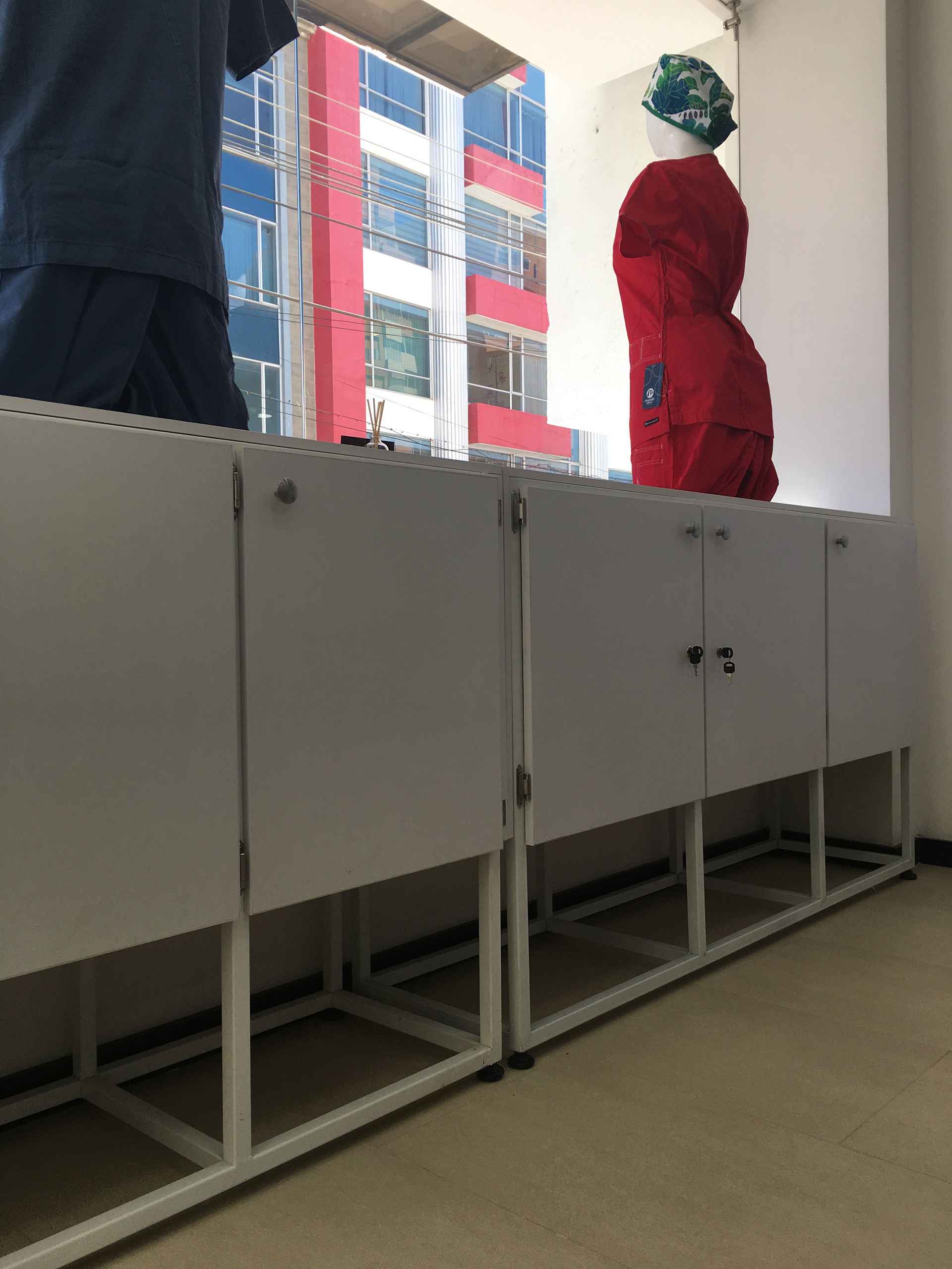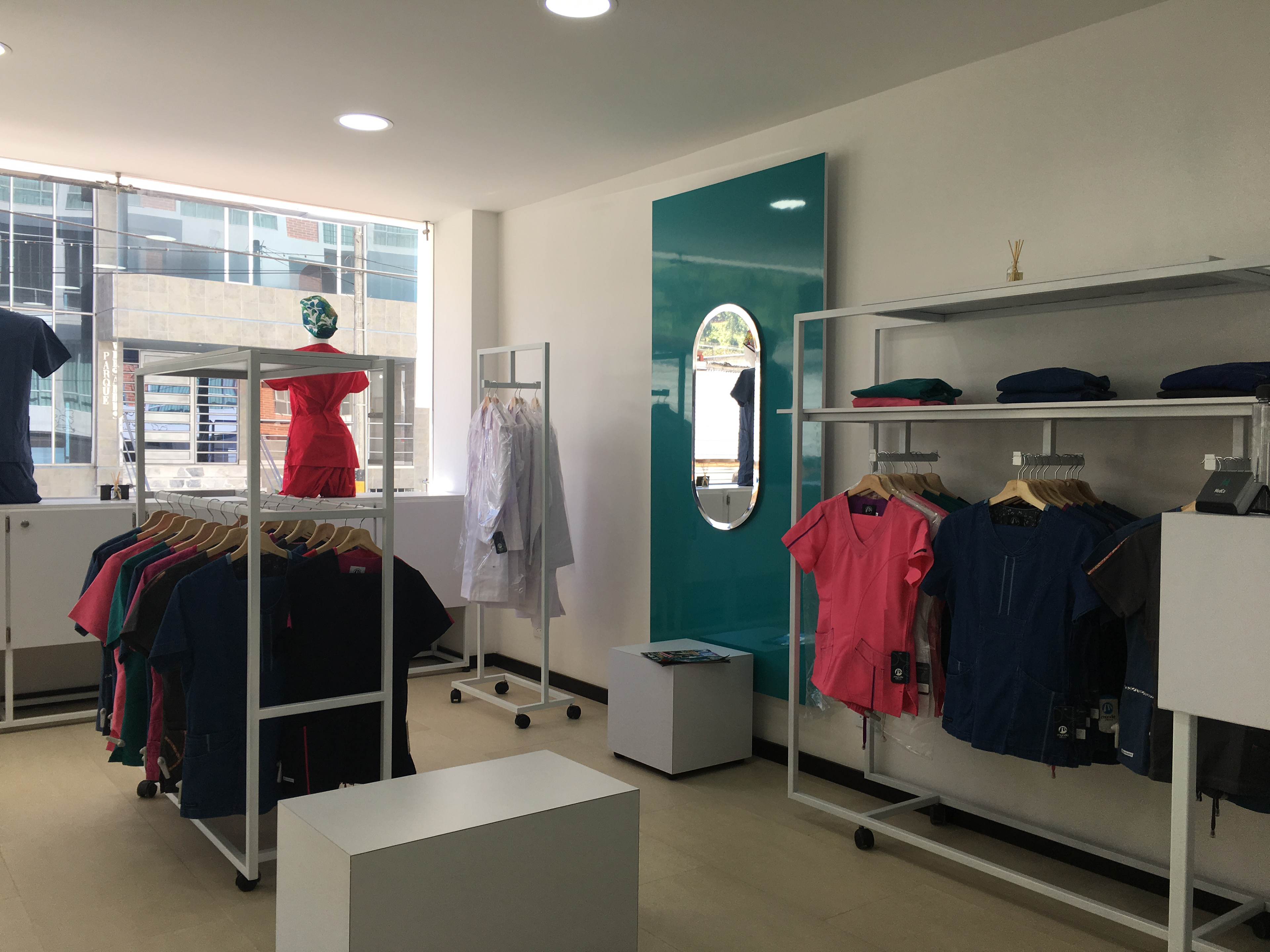 Diseño y montaje de mobiliario para atención y exhibición | Estanterías para bodega | Zona de vestier | Avisos rompetráfico interior y exterior. Cliente: MedCo
