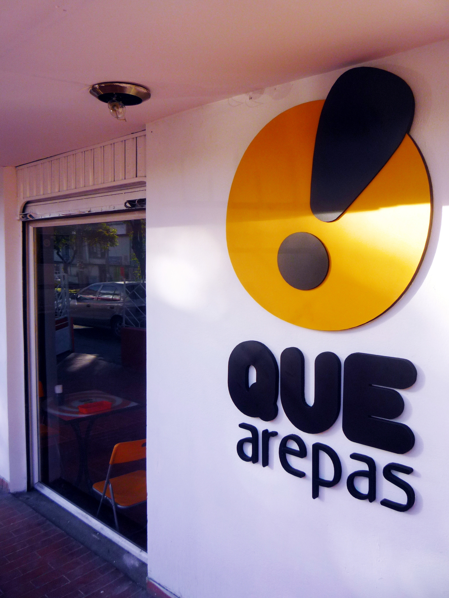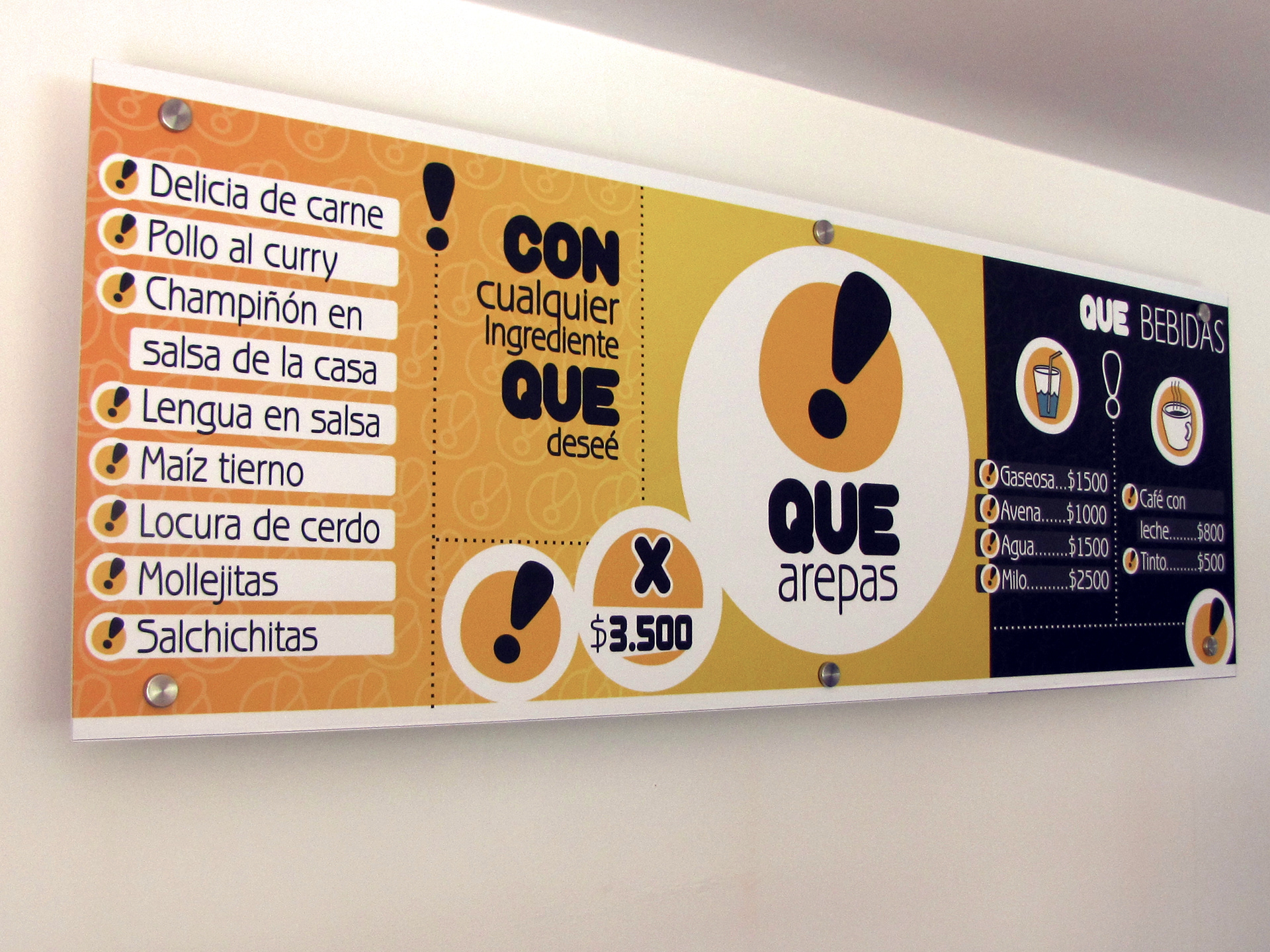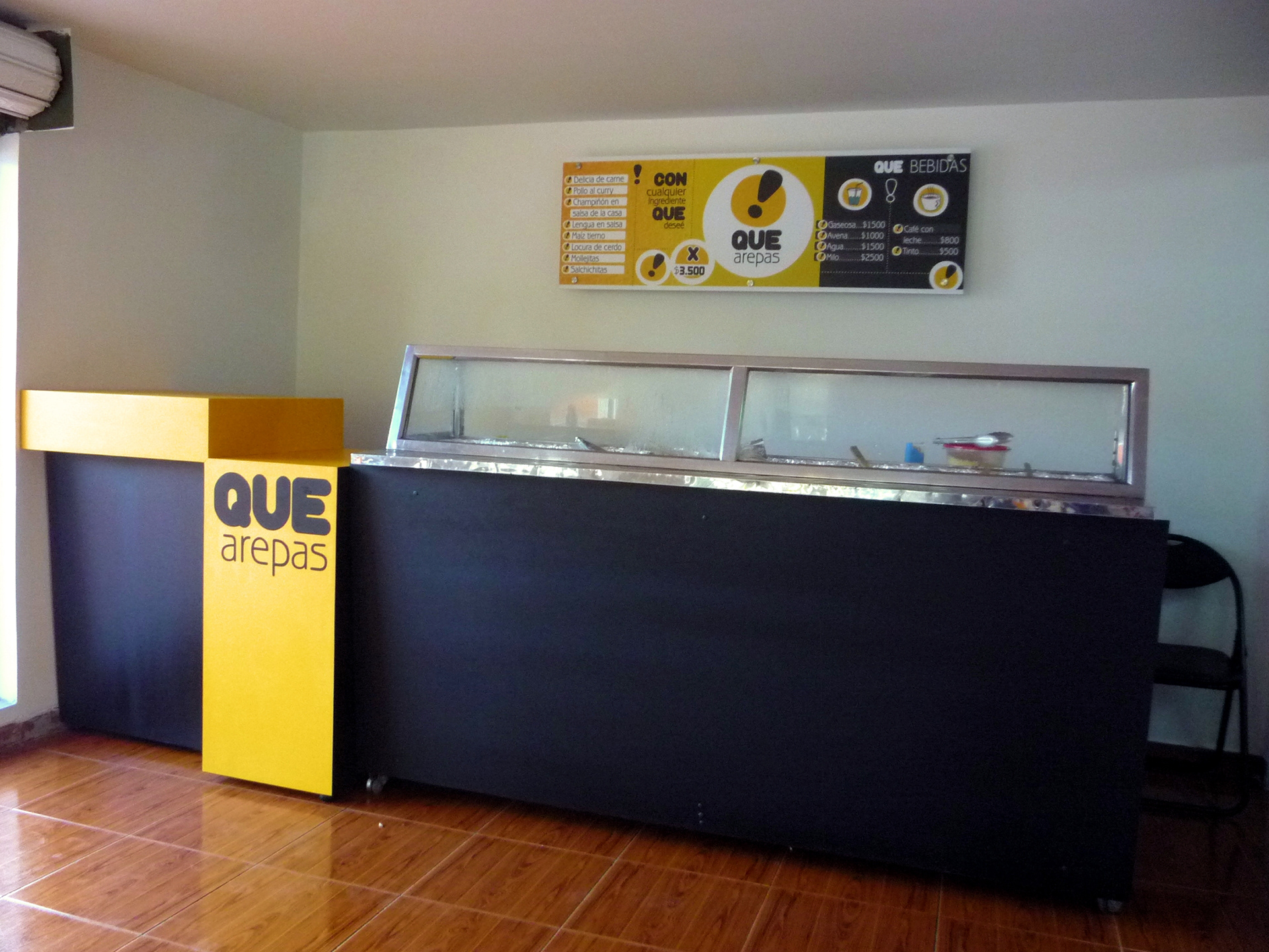 Desarrollo de imagen Gráfica Que Arepas! Comidas Rápidas / applications Gráficas en Interiores / aviso exterior / Vendedor silencioso / Decoración mesas / Diseño y Elaboración punto de Pago