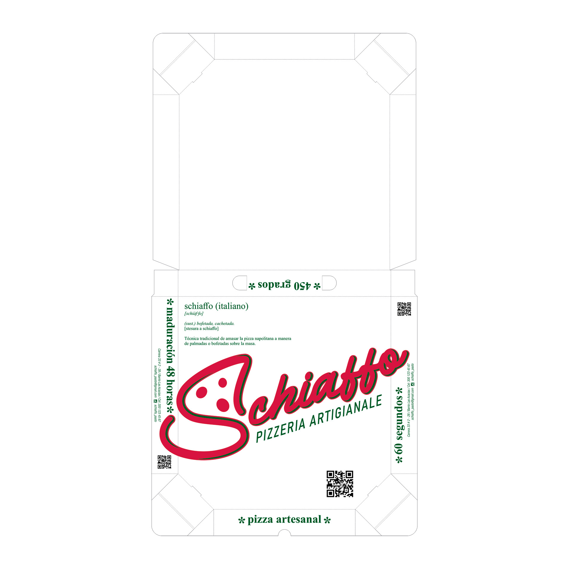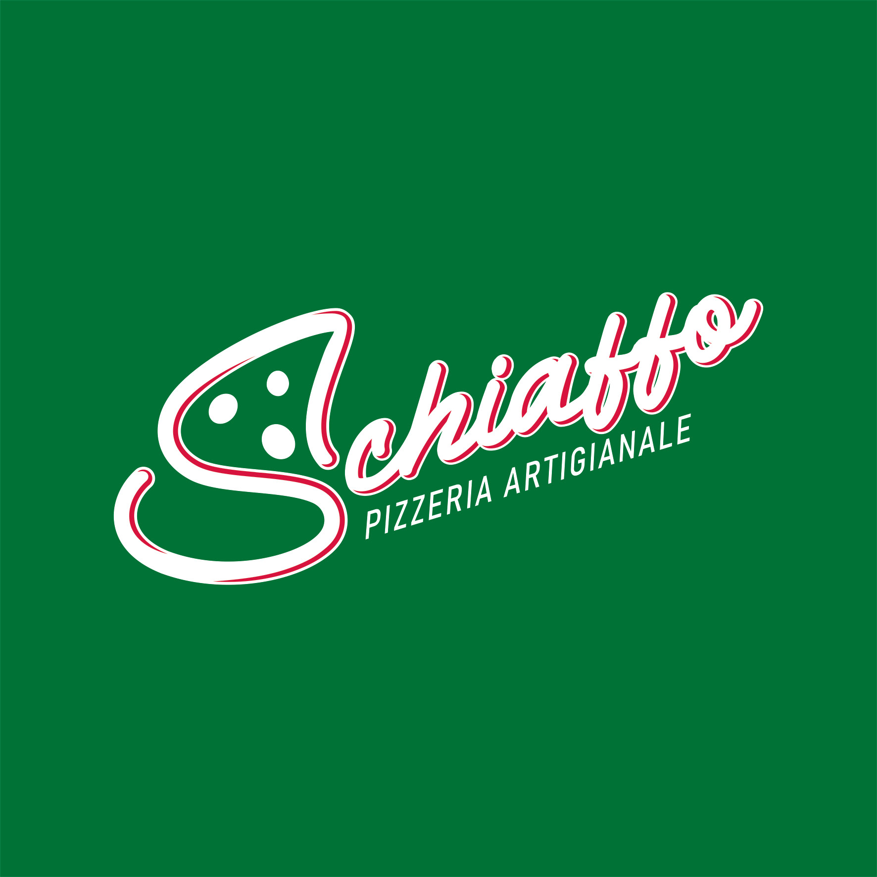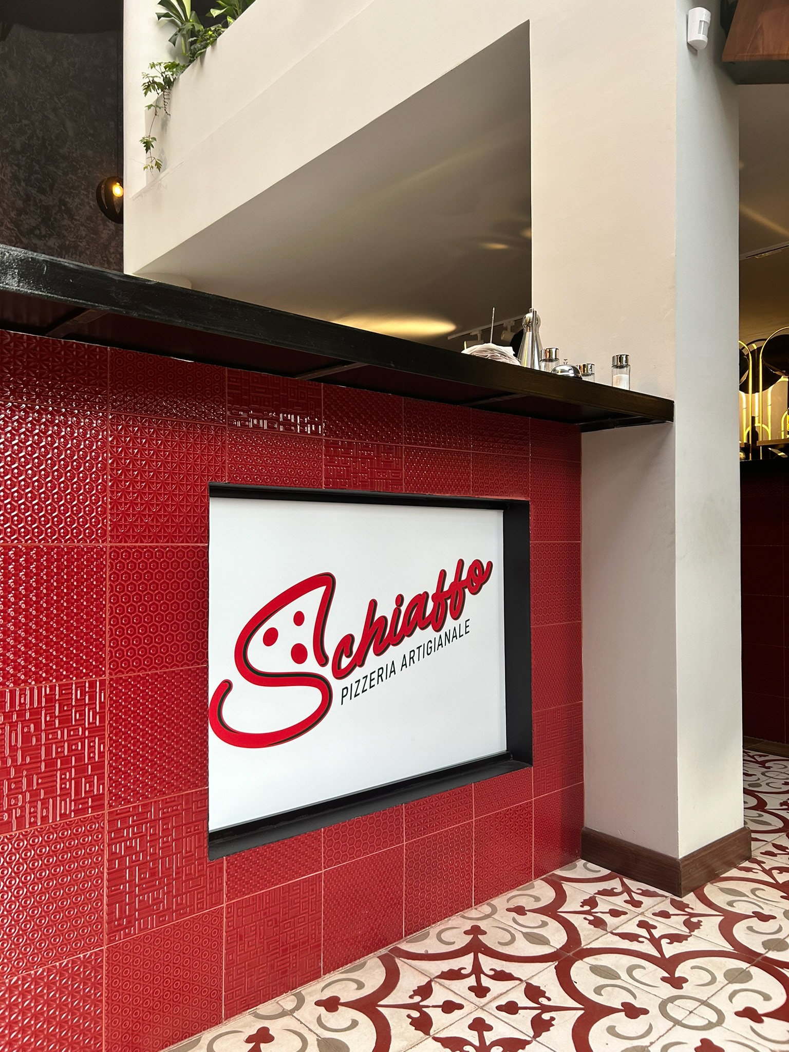 Proyecto desarrollo de Identidad Schiaffo Pizzeria Artigianale / Aplicaciones varias en papelería, uniformes y empaque / Aviso fachada / Cliente: Schiaffo Pizzeria Artigianale